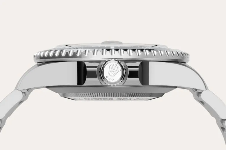 The 60-minute graduated, unidirectional rotatable bezel of the Sea-Dweller enables divers to precisely and safely monitor their dive and decompression times. It is equipped with a patented black Cerachrom bezel insert manufactured by Rolex in a virtually scratchproof ceramic whose colour is unaffected by ultraviolet rays. The graduation is coated via PVD (Physical Vapour Deposition) with a thin layer of platinum. The dial features large Chromalight hour markers and hands, filled with luminescent material that emits a long-lasting blue glow for excellent legibility in dark conditions.
