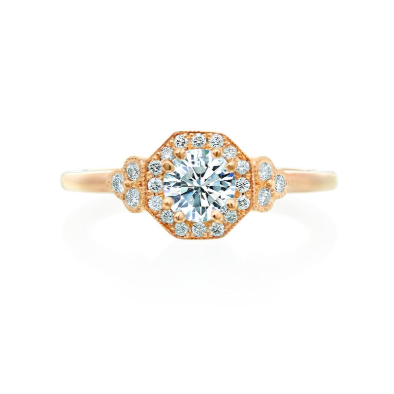 An exquisite 18kt rose gold Diamocta Engagement Ring Mounting. With a art-deco inspired octagonal diamond halo and trefoils of diamonds nestled on each side, for a total of approximately .20 carats. A Tiny Jewel Box Roslyn Collection original, to be finished with a center stone of your choosing (to be priced separately). Also available in 18kt Yellow Gold and Platinum, pricing will vary.