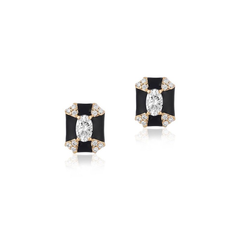 18kt Yellow Gold Queen Rectangular Hexagon-Shaped Diamond Stud Earrings with Black Enamel. Diamonds=0.56ttcw.