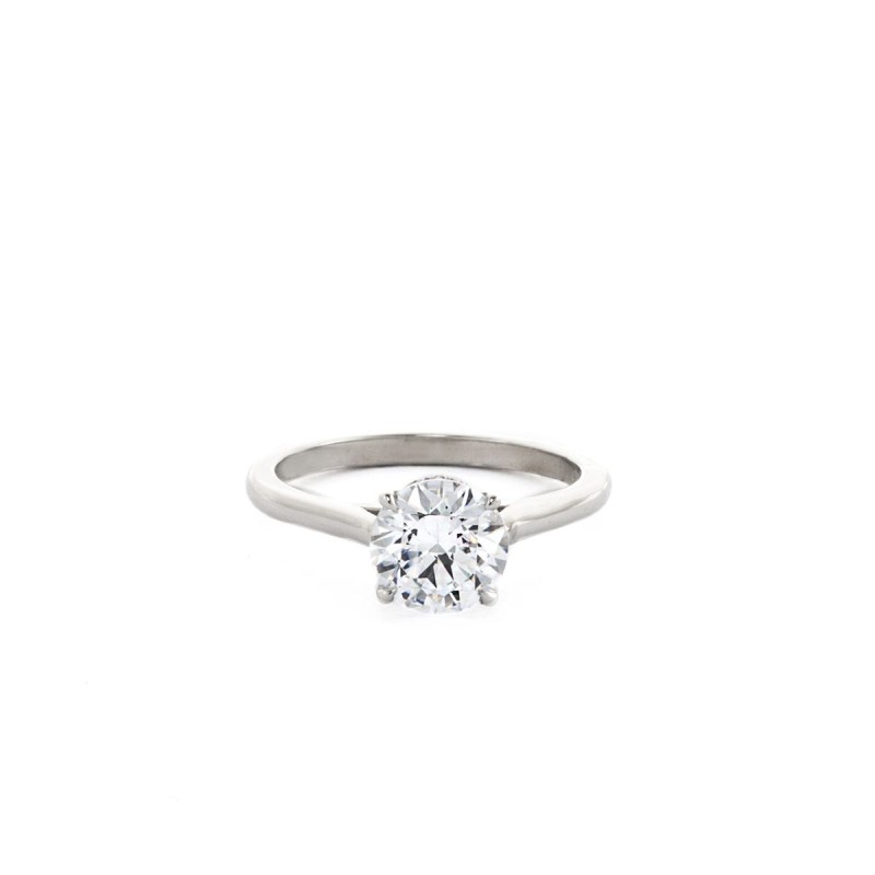 A beautiful and classic platinum four prong solitaire engagement ring mounting showcases the brilliance of your diamond. A Tiny Jewel Box creation from our Roslyn Collection.